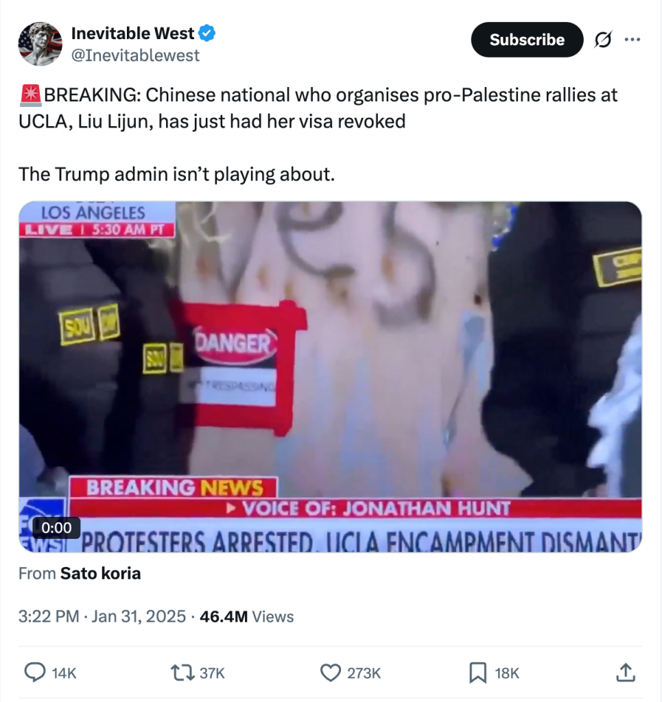 Eventually, the attention died down – only to reappear in early 2025. As the Trump administration began to put their wildest fascist dreams into motion, Twitter account @Inevitablewest tweeted the video with the caption, “Chinese national who organises pro-Palestine rallies at UCLA, Liu Lijun, has just had her visa revoked. The Trump admin isn’t playing about.”