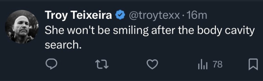 A long wait on the curb outside of Haines Hall and a bumpy ride on the prisoner bus ensued. As I was released from jail, messages from friends and acquaintances flooded my inbox, all linking the same post. An alt-right account, @LivePDDave1, had posted my arrest video and it was going viral. More accounts, fueled by hatred of women, Chinese people, and pro-Palestine protesters, hopped on the dogpile with glee. They called for people to “Name her and mark her with an X” and “Investigate the CCP connections,” gloating that “She won’t be smiling after the body cavity search.” These vile comments were grounded in misogyny, Red Scare rhetoric, and Sinophobic yellow peril ideology, implicitly and explicitly threatening pro-Palestine protesters.